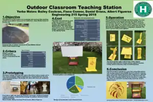 How can you bring a classroom nearly anywhere? Parties at Catherine L. Zane Middle School and Cal Poly Humboldt were pondering that very question. Team Yerba Mates and one other team were tasked with answering that question. After some deliberation Yerba Mates decided to focus on the instructor's portion of the classroom. The team went through several brainstorming sessions and determined that the most basic functional aspects of a classroom required by an instructor would be a level surface on which to store lecture materials and a writing surface to convey information to students. Due to frequent rain and winds in Humboldt County the client, Zane Middle School, requested the system be portable and storable. Yerba Mates finally decided on a fold-flat, collapsible podium and a whiteboard with shelving.
