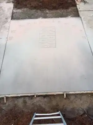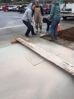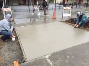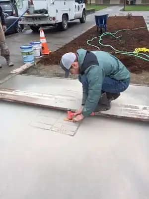 After the concrete has been poured and smoothed out, allow the concrete to cure for 30 to 45 minutes. Begin laying out center string lines.