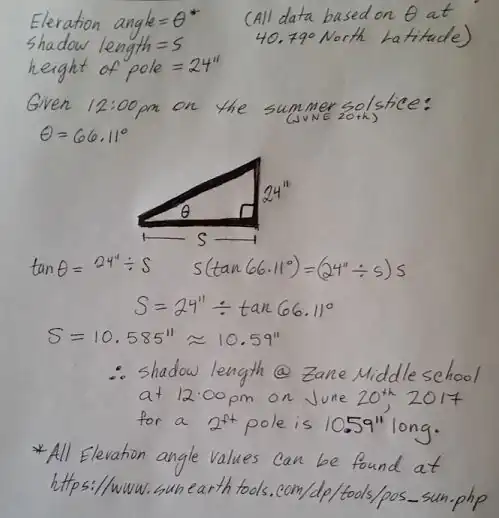 | 3 | Each of the season lines which are plotted into the cement is based upon the shadow length at each hour of the day throughout the year. The shadow length was calculated by taking the tangent of the angle of elevation of the sun at each hour of the day on the equinoxes as well as the solstices. Using right triangle trigonometry, it was determined that the shadow length equates to the height of the pole (24") divided by the tangent of the mentioned angle. | ![]() |