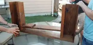 Build frame according to the measurements having two strong wooden pieces supporting the garden section. Screw the centerpiece at an angle allowing for the water to flow downwards. At the bottom end of the angled piece of wood drill a hole for drainage.