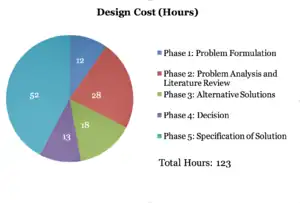 Below and is a table showing the cost of the materials used along with the grand total (the total does not include the value of materials that were donated). Figure 4 shows the amount of hours spent in each phase of the design project along with the total amount of hours.
