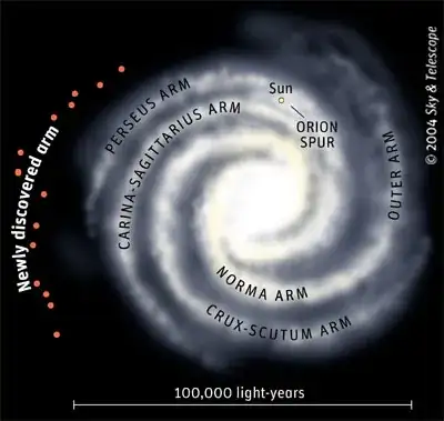 This arm has one end at the center of the Milky Way; this end is called the Norma Arm. It's actually quite small. However, as you continue outward along the lanes of gas, dust and stars, the Norma Arm becomes the - wait for it - Outer Arm.