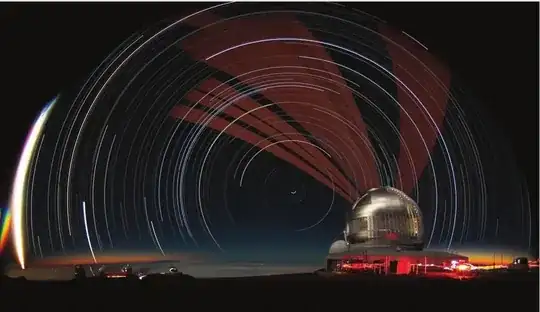 Star trails beyond the Gemini Observatory on Mauna Kea, from which a laser beam forms a guide star on the Earth's ionosphere that enables the use of adaptive optics. In this long exposure, the laser beam tracks across the sky, making the visible arc. (The object in the sky at which the laser was pointed changed several times during the night.) Note that stars rise and set at an angle (not perpendicular) relative to the horizon, because Hawaii is about 20 degrees north of Earth's equator. Also, the farther a star is from the pole, the more its path looks straight, over a short distance.