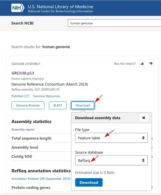 This will download a genome_assemblies.tar file which contains the feature table file, GCF_000001405.39_GRCh38.p13_feature_table.txt.gz. This file has all of the annotated features in a tab-delimited format with the following fields: