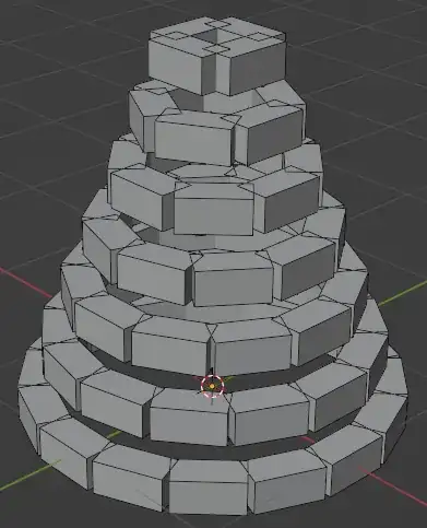 I don't think you can avoid Geometry Nodes as something like a modulo operator is required as the building goes up. You keep the number of bricks per row constant, reducing the horizontal size of a brick linearly with the height to keep a conical shape to the tower. When the perimeter is once again an integer multiple of the original brick size, you reduce the brick count by one, and you repeat the process. Would you like some piece of GN graph to start with ? – StefLAncien Dec 29 '23 at 07:33