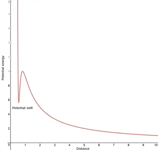 This should be similar, right? Actually, no. There is a very important difference between this reaction and the previous one; the reagents now both have a net positive charge. This means there is now a strong additional repulsive force between the two. In fact, the graph above changes completely. Starting from zero potential at infinity, instead of a slow decrease in potential energy, the lone proton has to climb uphill, fighting a net electrostatic repulsion. However, even more interestingly, if the proton does manage to get close enough, the electron cloud can abruptly envelop the additional proton and create a net attraction. The resulting graph now looks more like this: