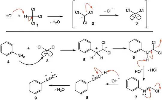 The reaction of aniline with chloroform and base (Hofmann isonitrile synthesis, 1867)[1] predates the Reimer-Tiemann reaction (1876)[2] with phenol by 9 years. Strong base reacts with chloroform (1) to form dichlorocarbene (3). The sequence 3 $\rightarrow$ 9 leads to phenylisonitrile (IUPAC: isocyanobenzene). The electron pair on nitrogen in structure 6 can also, and likely preferably, be used to eliminate chloride leading to chloroimine 7.