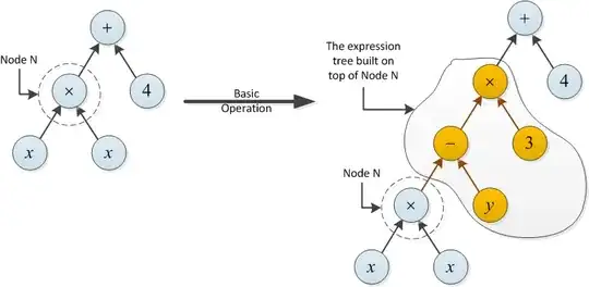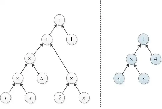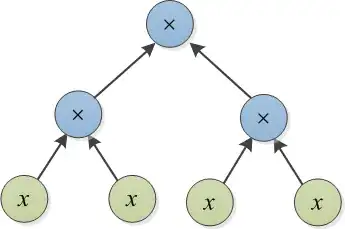 Example 2: Let T1=$x^4$ be represented by the following tree. To convert T1 to T2=$x^4+4x^3+6x^2+4x+1$, it suffices to add 1 to each of the $x$ nodes, to optain $(x+1)^4$=T2. This can be done by adding a cost-1 expression tree on top of each $x$ node. This example shows that the term-by-term conversion (which I called the greedy approach at the beginning of this post) is not an optimal approach. That is, if one wants to produce terms in T2 which are not present in T1 (i.e. $4x^3$, $6x^2$, $4x$, and 1), the cost will be much higher.