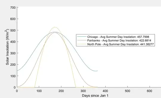 from Wikipedia resulted in the graph labeled "Direct Insolation Example", which appears to be incorrect. In any case, that effect seems to be relatively minor. The only major difference that I can think of between the summer climate characteristics of the cities and the north pole is that the north pole is oceanic, and thus has to deal with the very high thermal inertia of the very cold water surrounding it, making it unable to have warm summers despite similar solar insolation. In addition, I understand ice has a higher Albedo than land, and thus the actual amount of energy received is lessened. However, how is that fundamentally different than locations with thick snowpack that eventually melts over the summer?
