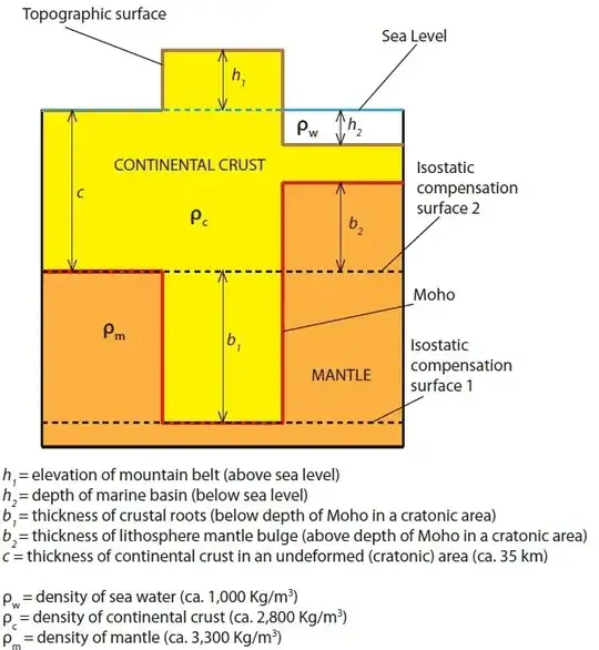 Cartoon explaining the concept of isostatic equilibrium, according to which topography (h1) is sustained by a crustal root (b1) in the same way that the elevation of an iceberg reflects the size of its submerged part.