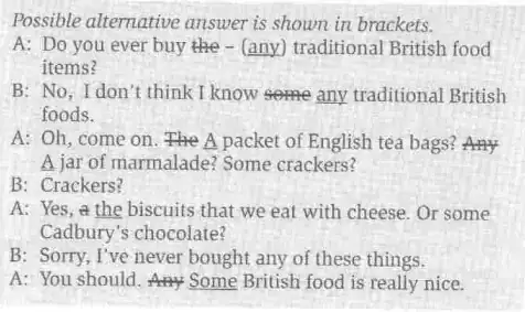 The following is the answer key for an exercise in Macmillan's Straightforward Intermediate coursebook. The instruction asks the student to correct six mistakes (concerning determiners) in the following dialogue: