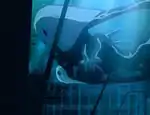 The Angel Sachiel[3] approaches underwater towards Tokyo-3, as a JSSDF tank battalion awaits it on the shoreline. A state of emergency has been declared and people have fled to shelters, leaving the region deserted. Shinji Ikari, recently arrived in a nearby town, has remained above ground waiting for Misato Katsuragi, who is due to pick him up.