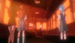 In a retake of Episode 15, Asuka asks Shinji if they should kiss. Misato interjects with her refusal to lend Asuka her perfume: "That stuff's not for kids!" Asuka nevertheless walks up to she like she did back then, but then she tells him that he doesn't understand anything about her. Shinji says that he does, but Asuka replies with a kick to his leg, saying "Do you think you understand me? Do you think you can save me? That's nothing but your conceited ego!" and finishes by exclaiming that he will never understand. Growing frustrated, Shinji insists that he has always tried to understand her, but it is impossible for him to do so if she never tells him anything, while scenes of Asuka rejecting Shinji throughout the series are shown. In the Personal Hell Traincar, Rei asks Shinji if he really tried to understand and he sullenly says he did.