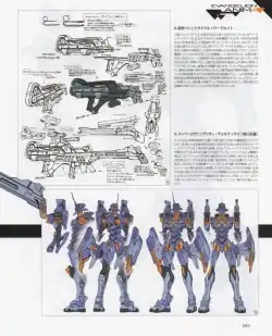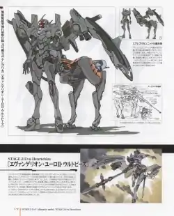 The mecha unit thought to be based on the remnants of the Mass-Produced Edition (MPE) of EVA that were captured at the battle over Nerv HQ and later went missing. It has a cocoon shaped container at the abdominal region, which has a part of angel inside, and it can summon the ability of that angel (e.g. flashes for Sachiel, Sea of Dirac for Leliel etc) Its main armament is a weapon with the shape of a sasumata.
