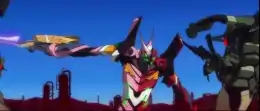 In the preview for 3.0 + 1.0, Eva 08+02 is seen in the ruins of Tokyo-3, fighting an army of Mass Production Evangelions. It appears to be equipped with a Magorox Sword during the battle. Eva 08+02 succeeds in cutting down several Mass Production Evas, as well as defeating some in close-combat. The preview ends with a swordless Eva 08+02 leaping into the air, revealing a massive group of Mass Production Evas producing several enormous AT Fields around the fallen Black Moon.