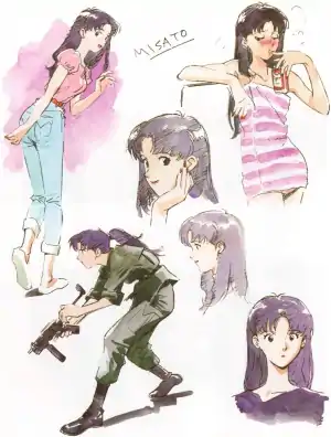 - The character design request from Anno was that "the lead character is a girl, and has an older-sister type figure like Coach next to her," so it was structurally similar to "Gunbuster". So I first designed an Asuka-type girl as the lead character, but after "Gunbuster" and "Nadia" I felt some resistance to making the lead character a girl again. [...] The most difficult was Misato. So I thought it would be interesting to have someone like the older girl next door as a military person. I really wanted to make her a character who changed her clothes constantly, but I have no fashion sense so I wasn't able to do it. (laugh) I imagined Misato as a looser girl who, taken to the extreme, would be sleeping with all the men at Nerv and so on. Furthermore, she would not think too seriously about all of that... "Interview with Sadamoto Yoshiyuki", Der Mond