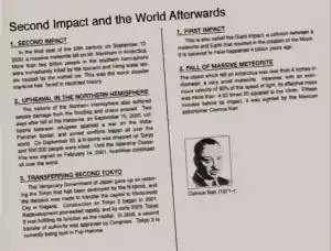 According to the official report on the disaster by the United Nations, the massive explosion was the result of a meteorite impact that struck Mount Markham. Hence the event was dubbed "Second Impact" (as opposed to the "First Impact," the theorized massive meteorite collision 4 billion years ago that created the Moon. First Impact was actually caused by Lilith's arrival on Earth.[2]). The meteorite was supposedly too small to detect but was traveling at near the speed of light, resulting in it striking with tremendous force despite its size.
