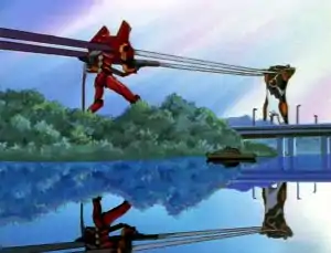 Zeruel breached Nerv headquarters and descended to Central Dogma, breaking through the wall into the command center's central display area. The Angel attempted to kill the personnel inside but was stopped by Eva-01, which fought it out of the room. Zeruel blasted off Eva-01's left arm but the Eva succeeded in forcing it onto an Evangelion launching catapult, taking the fight to the surface. Eva-01 battered Zeruel and was on the verge of ripping off the Angel's face before it ran out of power.
