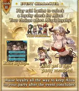 Clearing an event raid battle certain times after having completed the event story will let you play Aliza's loyalty episodes. Talk with Aliza during the loyalty episodes and give the right responses to raise her loyalty. Raise loyalty all the way to keep Aliza in your party after the event concludes!