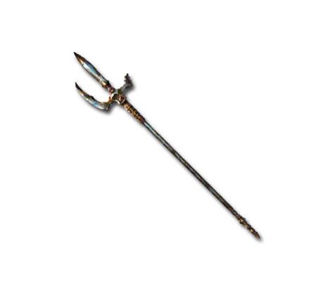 | A spear that was unearthed at an ancient battlefield. The passage of time has caused all decorations to peel off. The three prongs are damaged as if to indicate the ferocity of the battle in which this weapon was used. |