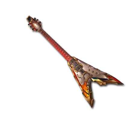 | The Sky Realm may never see a band as groundbreaking as the Doss again, but they won't be forgotten. This guitar was produced in collaboration with the lead guitarist and vocalist himself, Aoidos. Featuring the same type of strings he uses on his own guitar, you'll feel his soul with every pluck! But that's not all! Just look at how the body's contours and red finish perfectly match Aoidos's silhouette. Now, we all know guitars are meant for making music, but this instrument's revolutionary design allows it to perform under the most brutal conditions—and I mean brutal! You'll never know how you ever survived without one! *Act now while supplies last. |