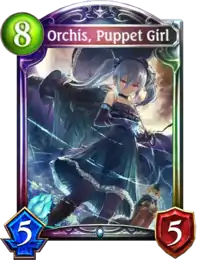 If you have at least 2 Puppets in your hand and 8 play points, Choose: Play this card as an Orchis, Resolute Puppet or an Orchis, Vengeful Puppet. |
