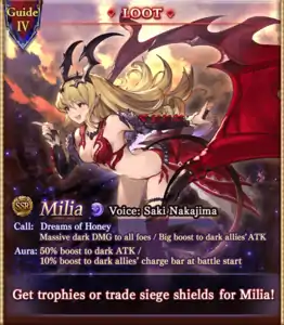 Earn event trophies to earn up to 3 copies of Milia. She can also be purchased once with Siege Shields.