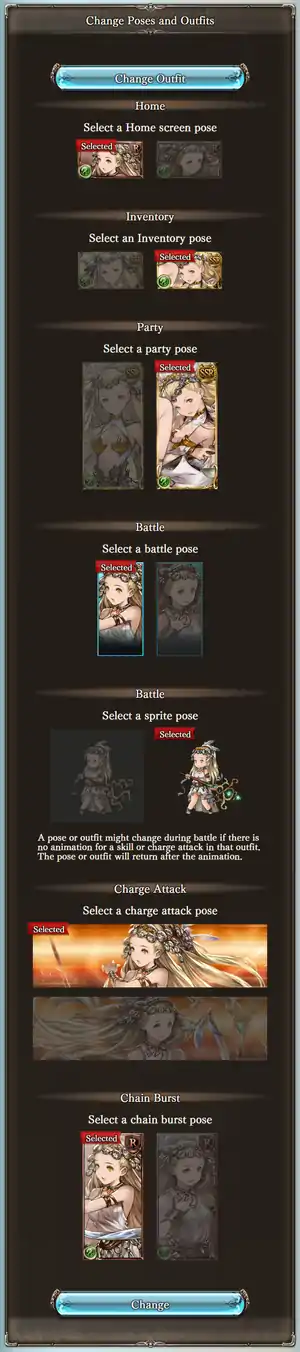 Outfits are different clothes or costumes that you can select for a character. You cannot use multiple versions of the same character in your party at the same time, but having multiple versions allows you to change outfits, which changes the battle sprite and Charge Attack animation. Outfits can also be obtained as a simple cosmetic option via in-game promotions or tie-in product promotions. For example, there are a number of idol costumes that are bundled with Granblue Fantasy music CDs.