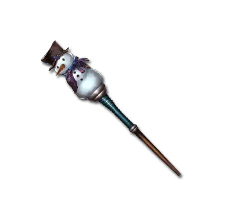 | This magic staff has a charming snowman perched atop the tip. It is cold to the touch, and creates a trail of snowflakes in the air with each wave. |