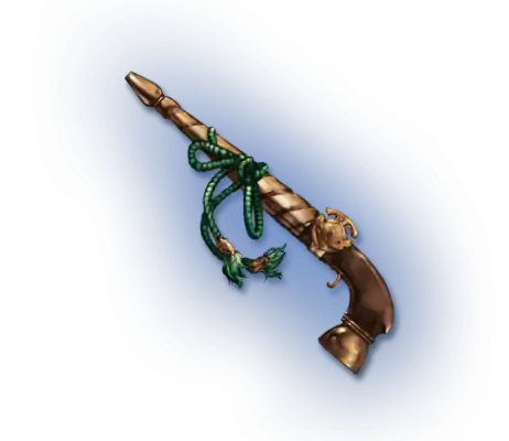 | A firearm for the gallant and dashing. With its grip lacquered in a luxurious burnt sienna, it was crafted to resemble a kiseru, the pipe favored by masters of commerce. Better yet, the ritualistic rope tied around its barrel is infused with sorcery, bestowing bountiful luck to its handler and assuring he or she never misses a mark—whether that target be in business or battle. |