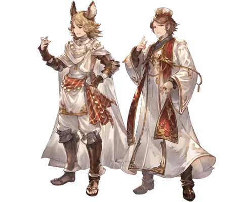 | Yusuf is a young Erune who once served in the guard under Volenna, while Nasir is a young man who was born to an affluent Human family and became a priest through his own knowledge and efforts. When Yusuf lost his family to the Manawydan disasters, Nasir's parents took him in and raised the two boys like siblings. While Yusuf served in the guard and Nasir in the holy order, they could only watch as Sable was ruined by its adherence to outdated customs. Nasir and other young priests began to accumulate revenue by developing Sable's tourism and foreign commerce, which sparked other young islanders to consider the history as well as the future of their home. All of them now work to stop the disputes over the island's scant resources as well as the cycle of sacrifice and blame. The younger islanders' anxiety over the future may well be what first spurred the priests to employ the sand spirit to defend against Manawydan. Perhaps it is when people are joined by common cause that Sable Island can move forward into a new future. |