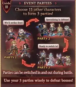 You can form up to three parties (one main and two sub parties) to battle in this event.