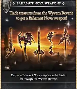 Newer players have an amazing opportunity to obtain one free Bahamut Nova Weapon. These weapons provide large stat bonuses to characters depending on their race and are a staple in many late-game weapon grids. The Main Character and "Unknown" race characters benefit from any Bahamut Weapon. The weapon you choose should be based on which character races you'll use more often.