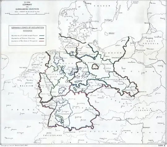 While British ideas were mostly oriented along existing administrative boundaries, the Americans sprung the idea to divide all up along the lines of religion: Protestant North-West, Catholic South-West and an Eastern part dominated by the religion of 'Prussianism' (as Roosevelt expressed en route to Teheran). Another idea by the British then also ignored administrative traditional borders and simply cut through the map. The Soviets at that point still favoured river lines as boundaries: Elde, Elbe, Saale, and Elster rivers, significantly further East.
