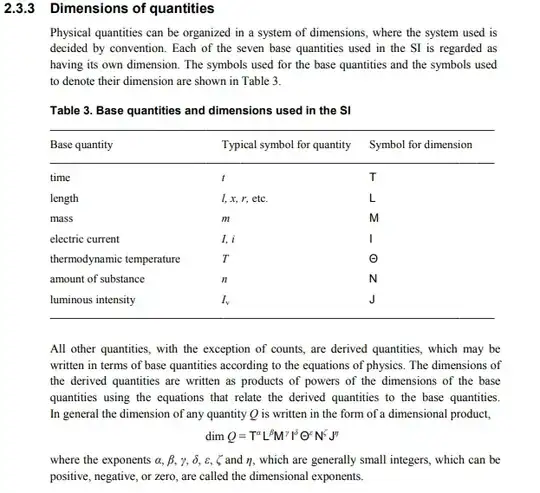 However, when looking things up for this question, which asks why the letter $\mathsf J$ was chosen as the dimension symbol for luminous intensity, I was extremely surprised to learn that this usage is extremely recent as far as the SI brochure is concerned: Over its almost fifty-year history, and nine editions, any talk of quantity dimension as something separate from the units is absent, all the way up to the 7th edition (1998), and it is only present in the 8th edition (2006) and the present 9th edition (2019).
