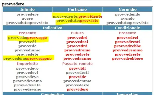 Why are there two ways of the conjugation of some verbs? For example "provvedere" shown in the dictionary. Is the red one more commonly used?