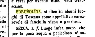Nell'ultima strofa di una poesia di Angelo Maria Ripellino, la n. 84 di Lo splendido violino verde, trovo la parola “sdrusolina”: