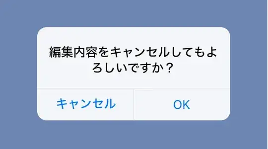 In designing the wording of buttons, it is important to avoid the Japanese expression "〜する" as much as possible. Cancel", "Discard", "Delete", "Select", "Download", and "......" all have an extra "suru" and seem redundant. It depends on the context, but in most cases, the meaning can be understood even without the "〜する" form, so it is better to use short sentences. In light of the above, this alert should be written as "Are you sure you want to cancel? can be rewritten as "Are you sure you want to cancel? can be rewritten as "Discard? The name of the consent button can then be "Discard".