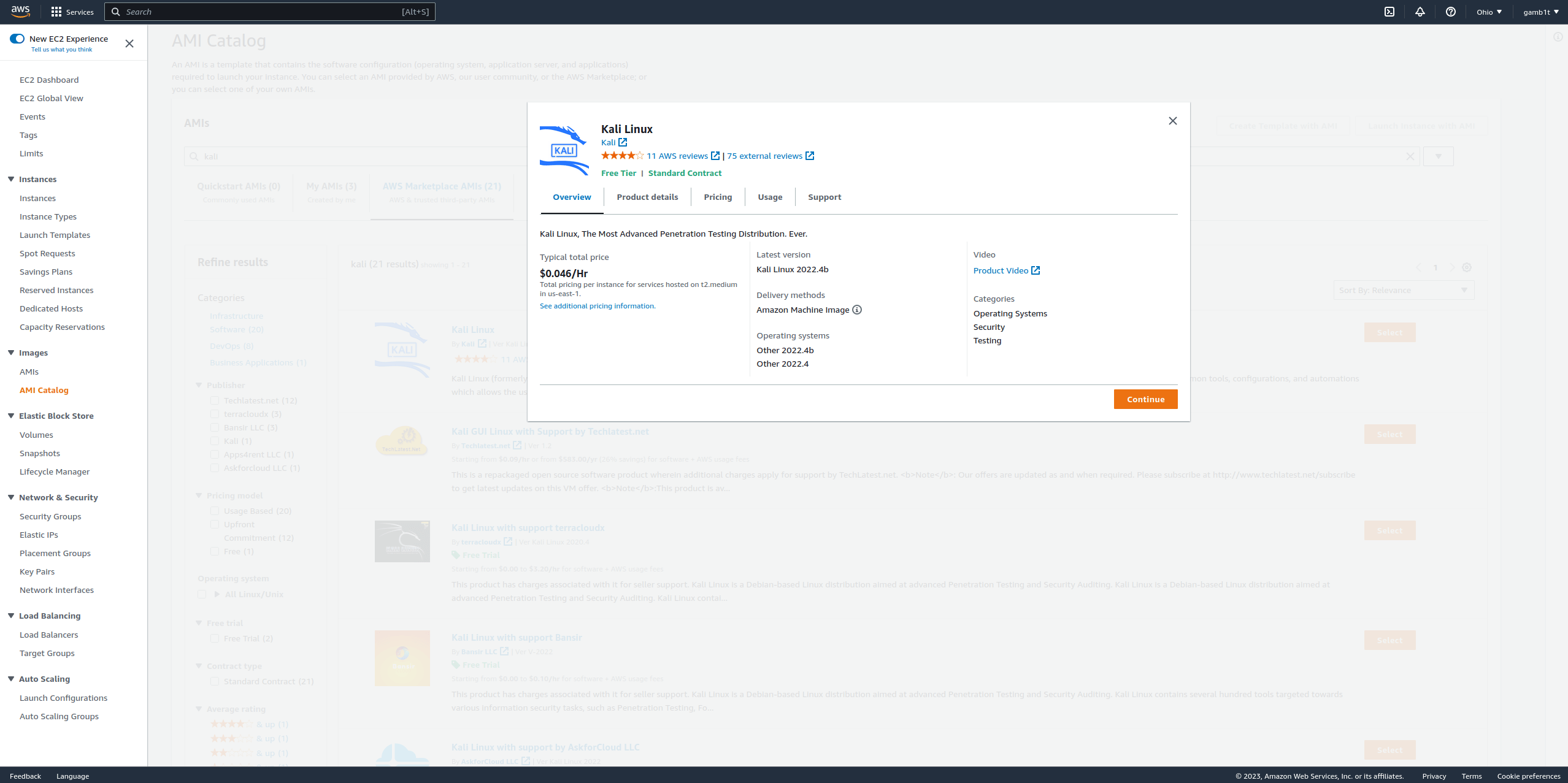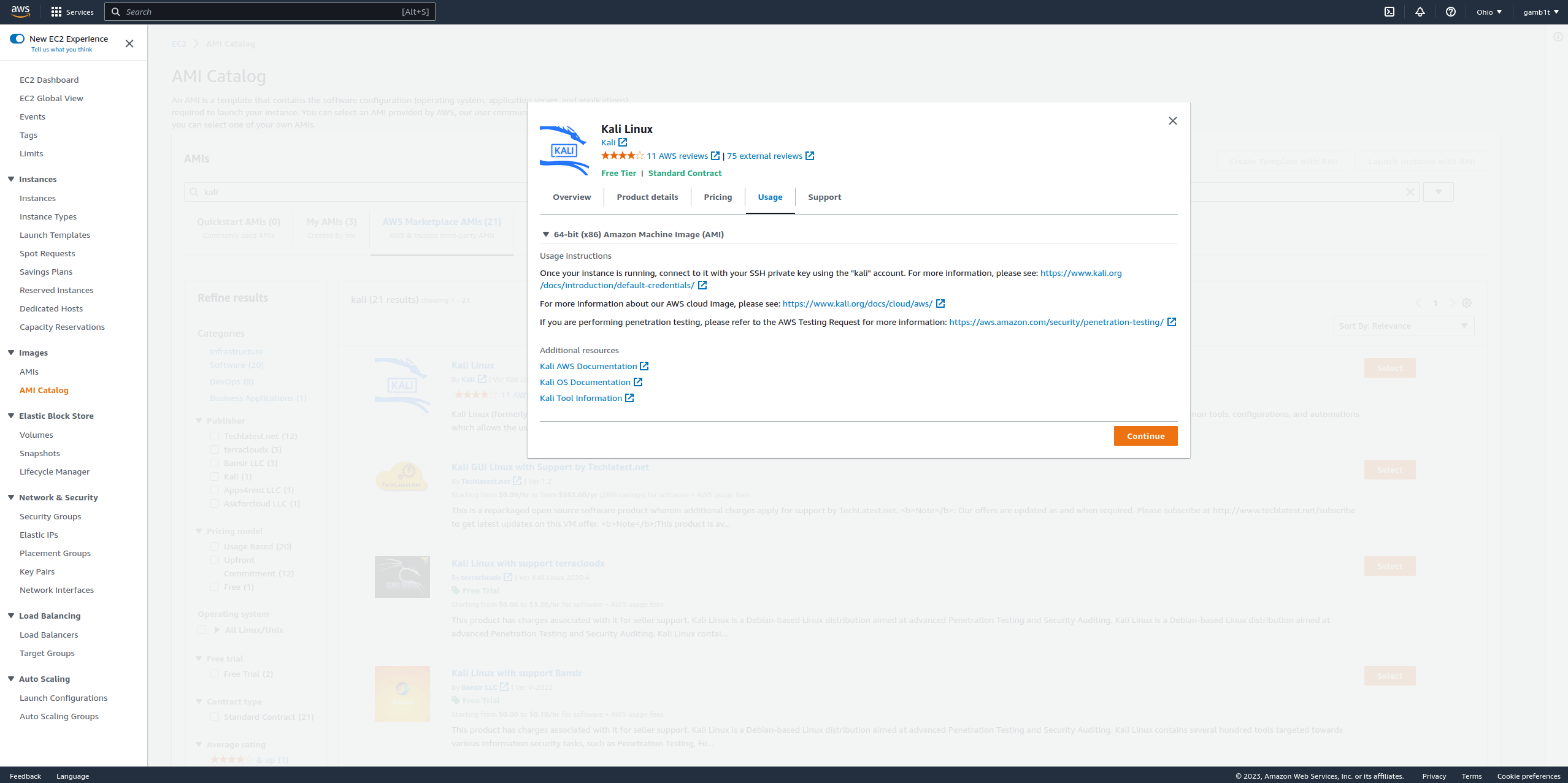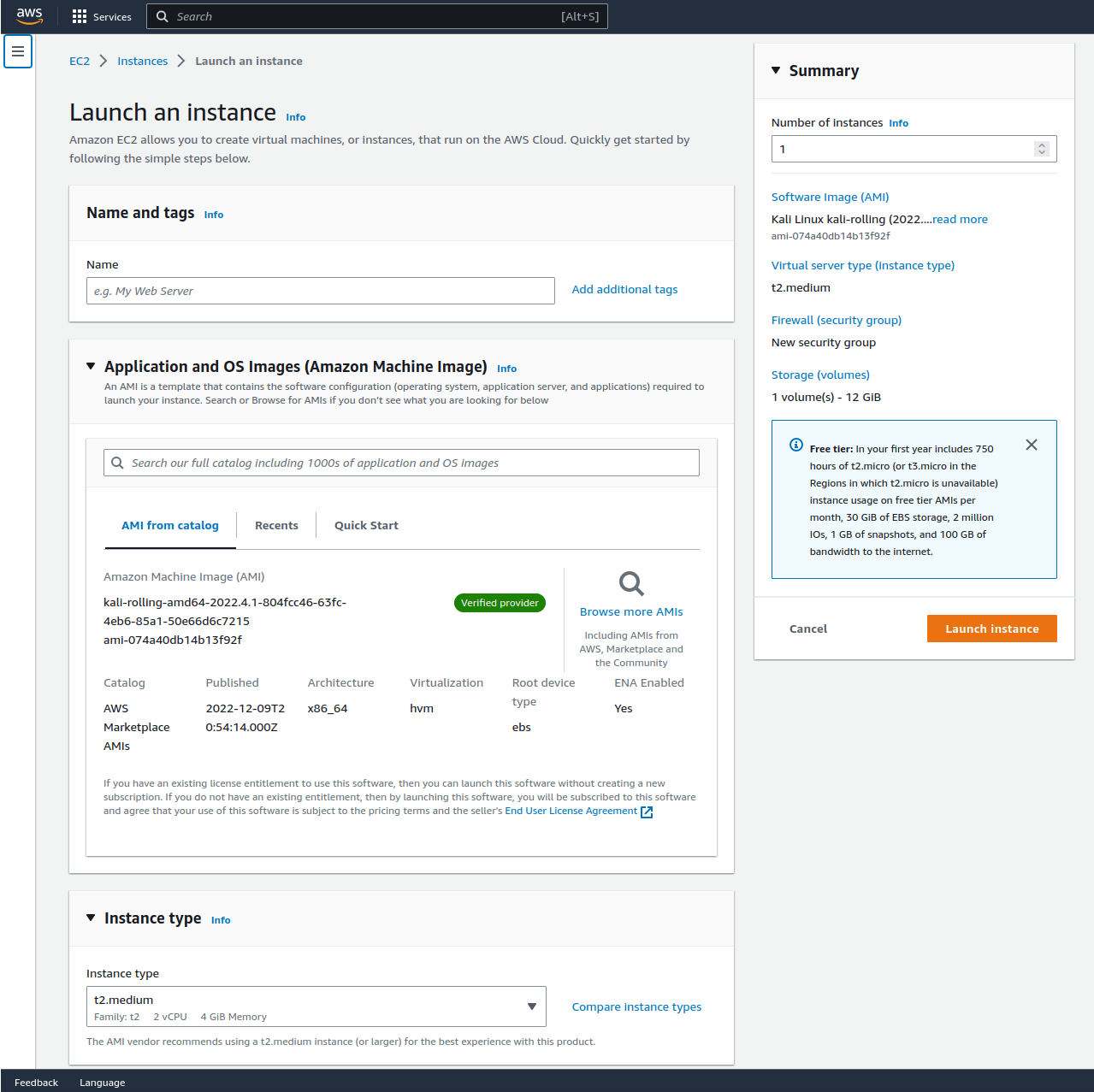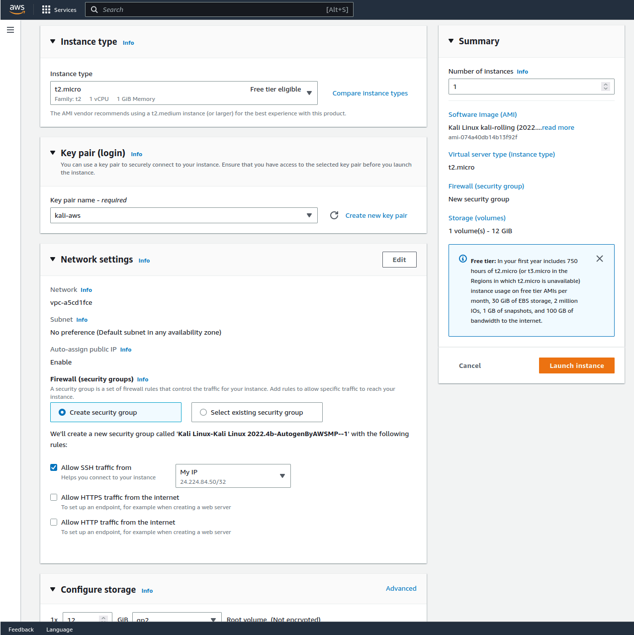 As of February 2023 the following is how to set up an AWS Kali instance. AWS’s interface is constantly being updated, and in the future may not be 100% accurate. Should this be the case, please file an issue on our GitLab and follow Amazon’s tutorials.