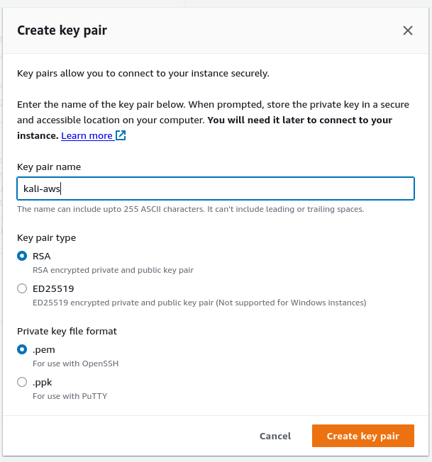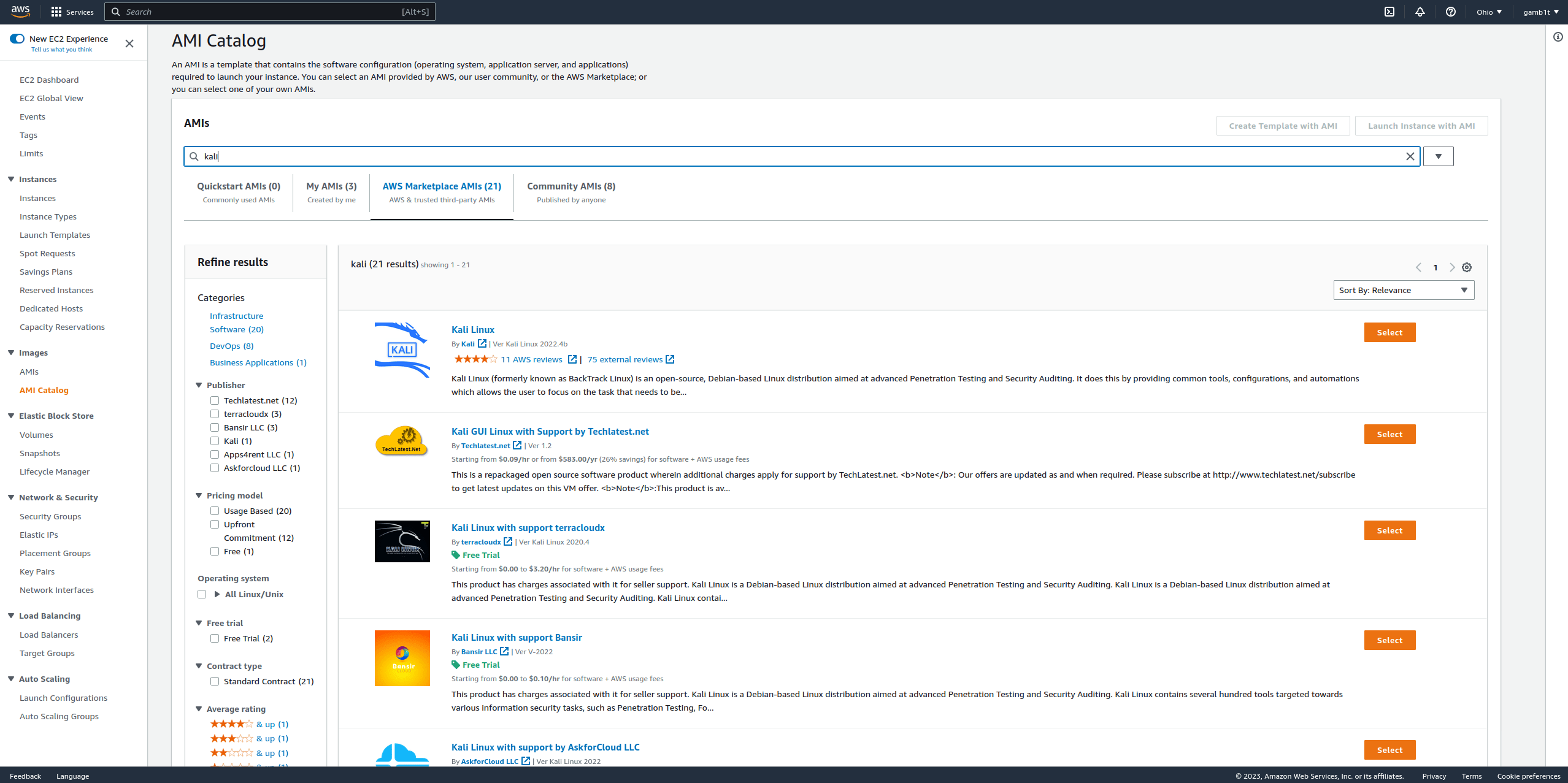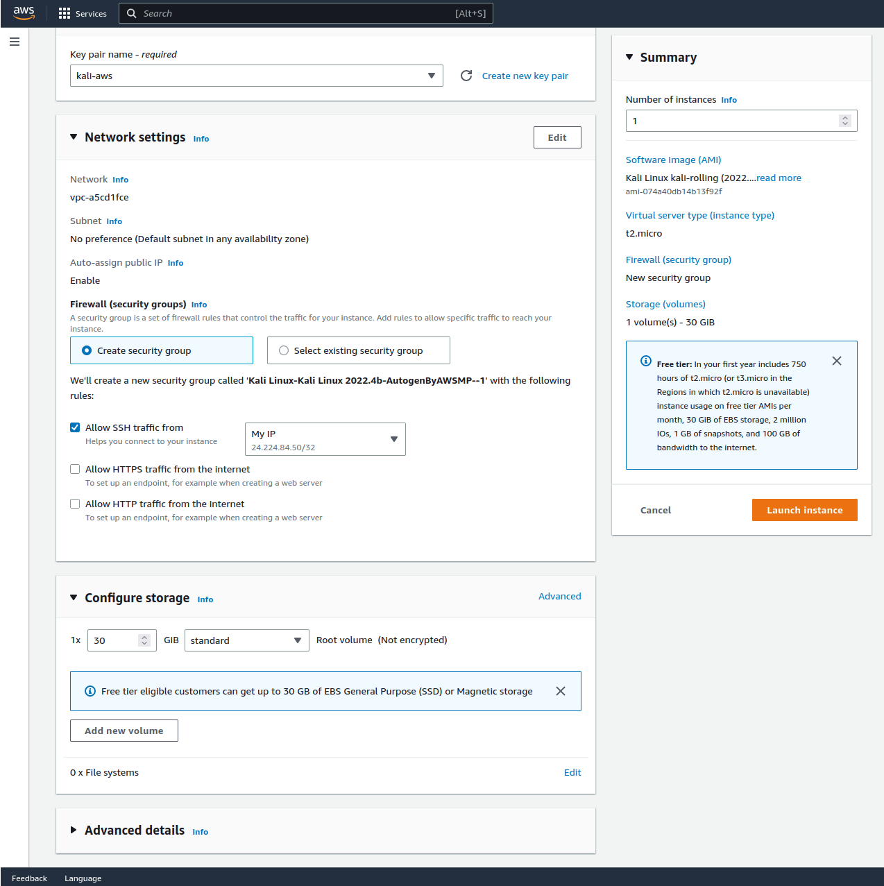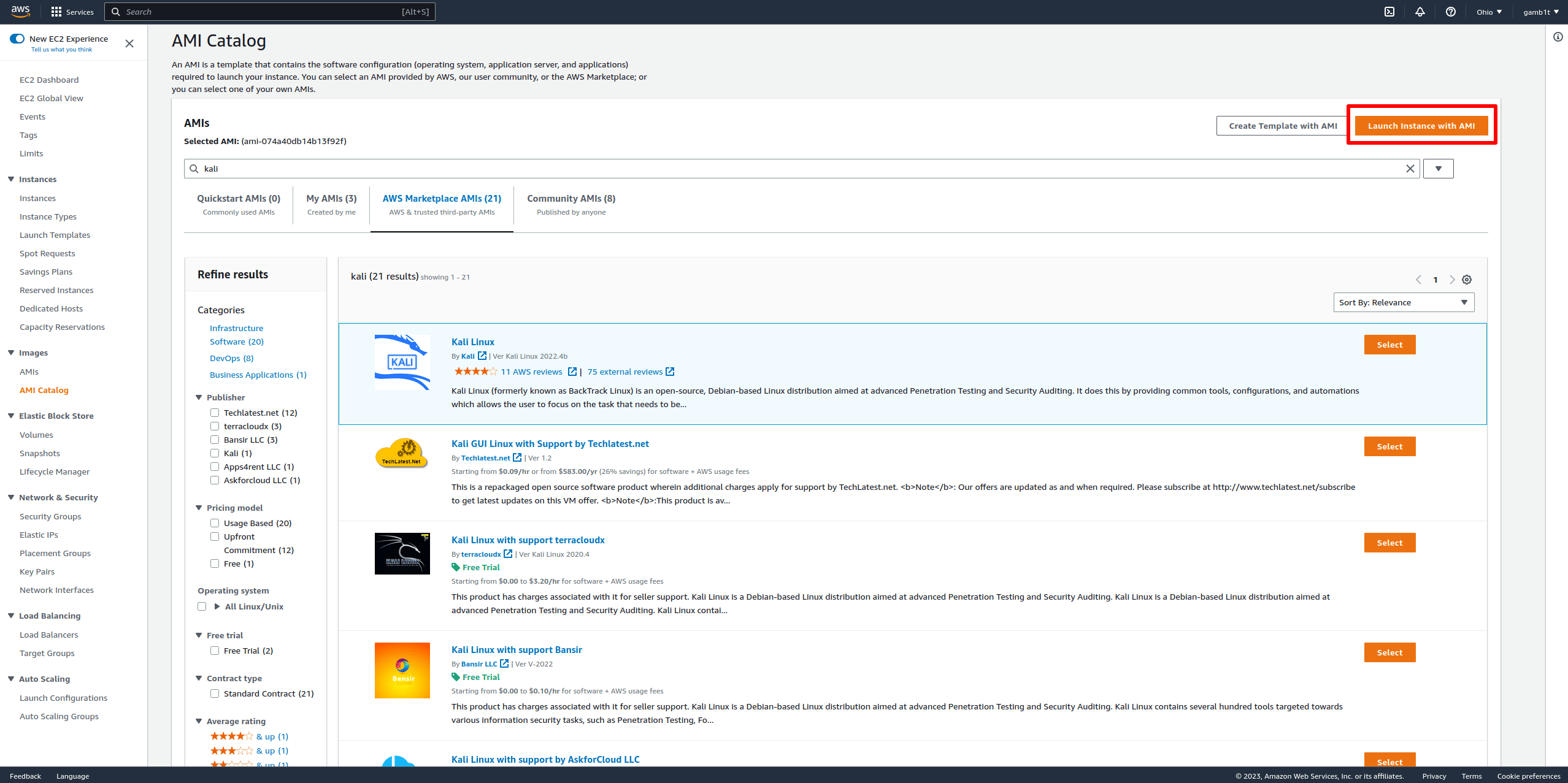 As of February 2023 the following is how to set up an AWS Kali instance. AWS’s interface is constantly being updated, and in the future may not be 100% accurate. Should this be the case, please file an issue on our GitLab and follow Amazon’s tutorials.
