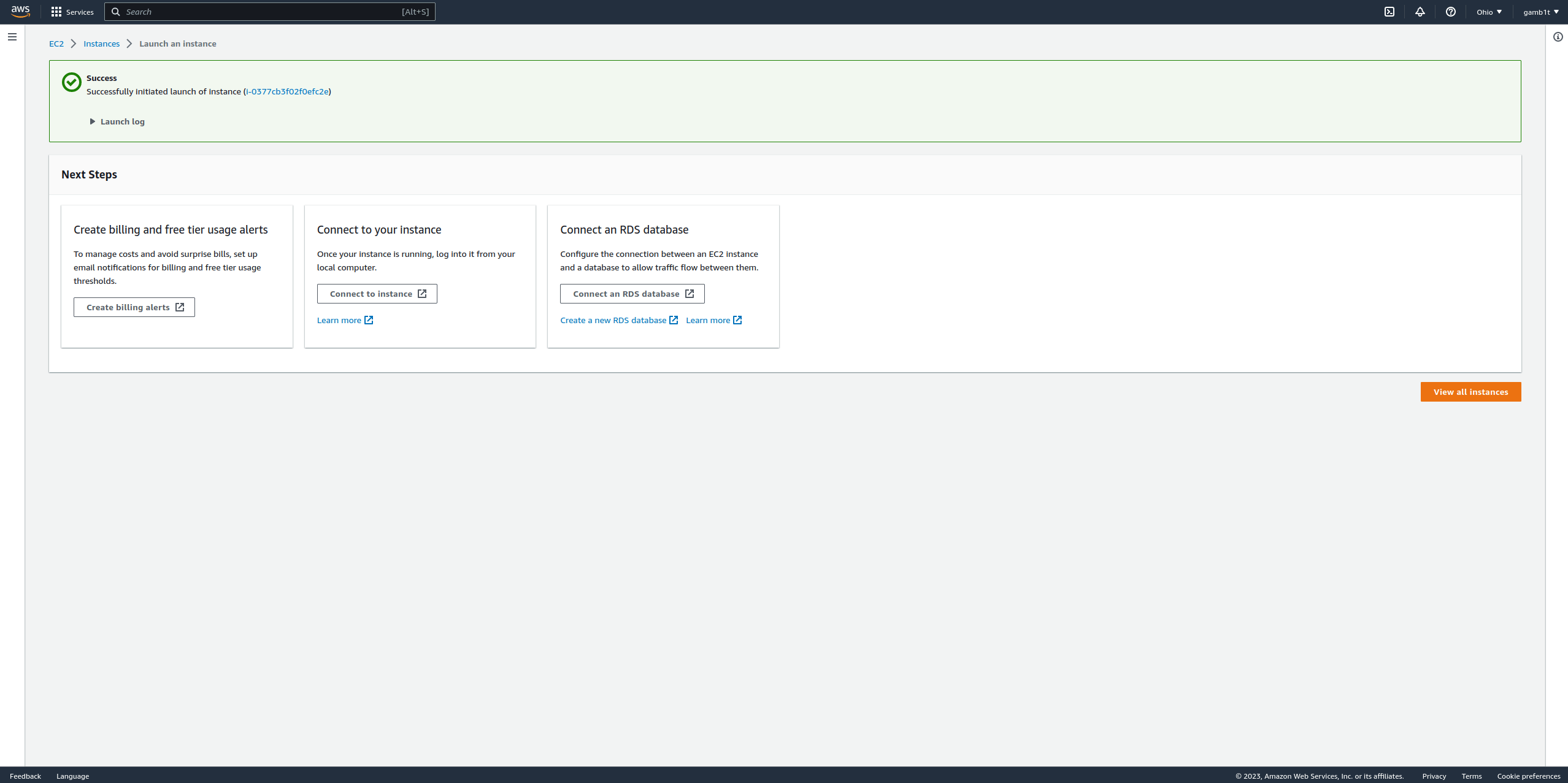 Once complete, we will select “Launch instance” and we will be faced with the following screen: