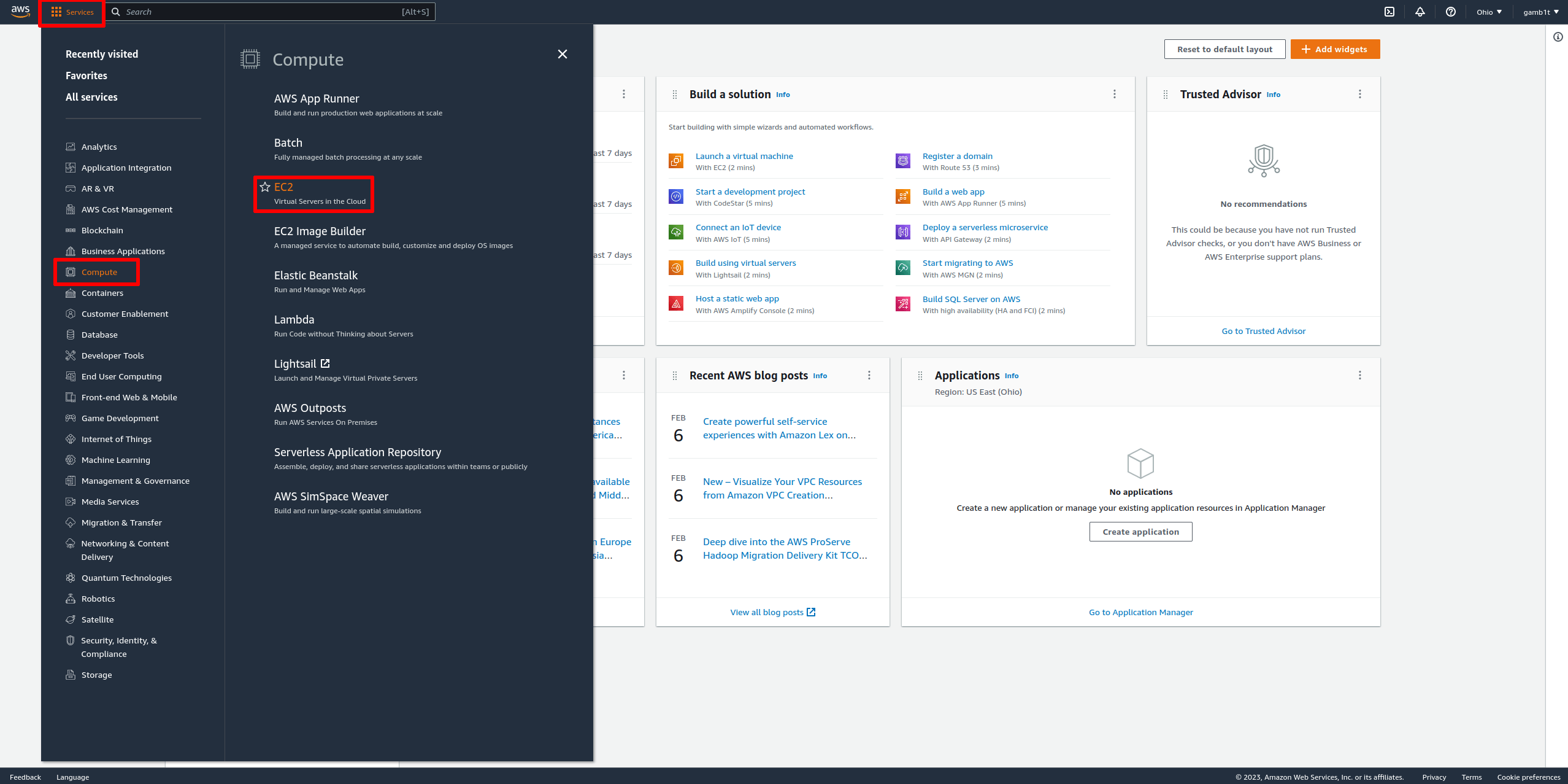 From here we want to click on “Services” in the top left, hover over “Compute,” and click “EC2” like shown: