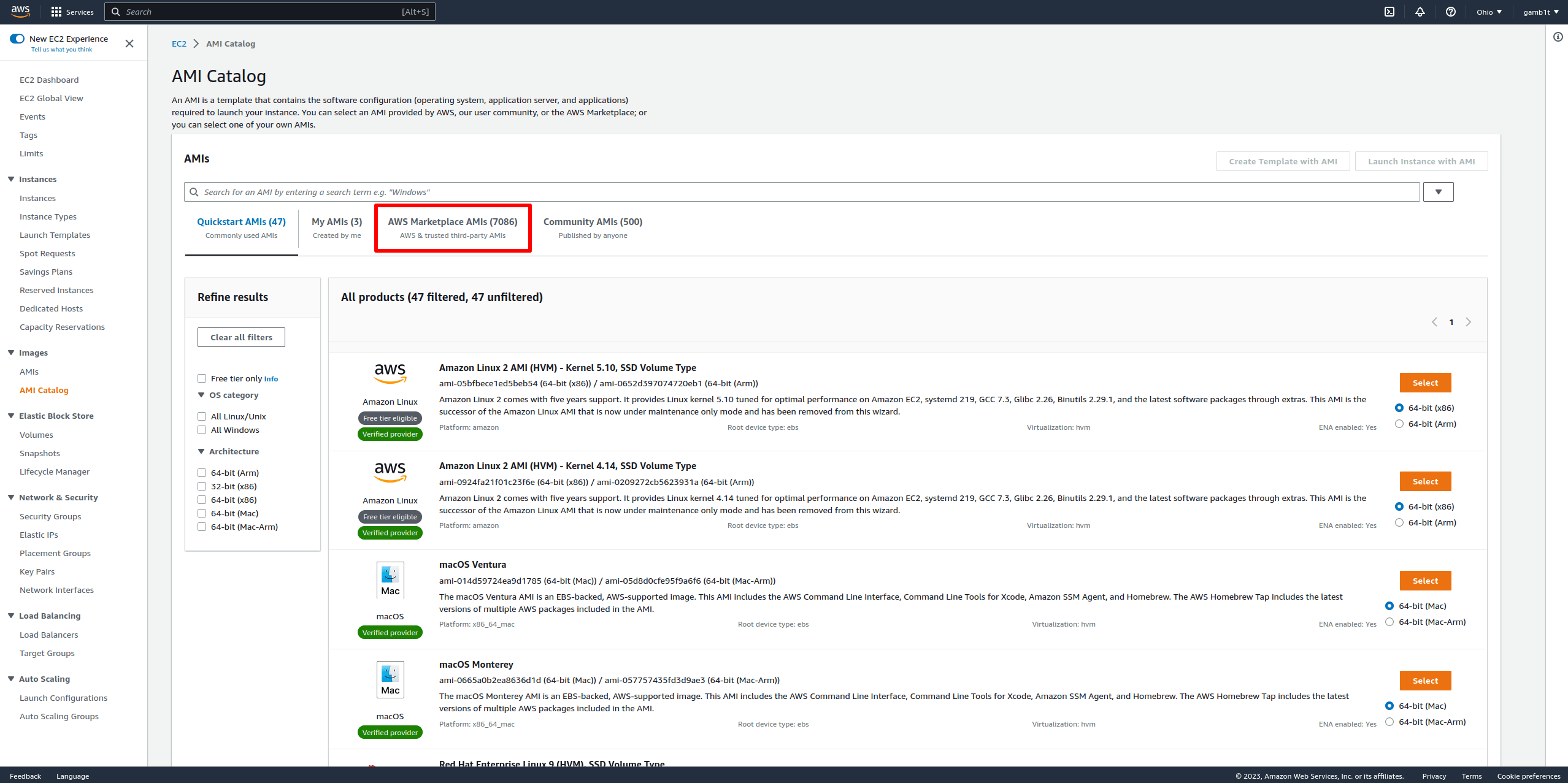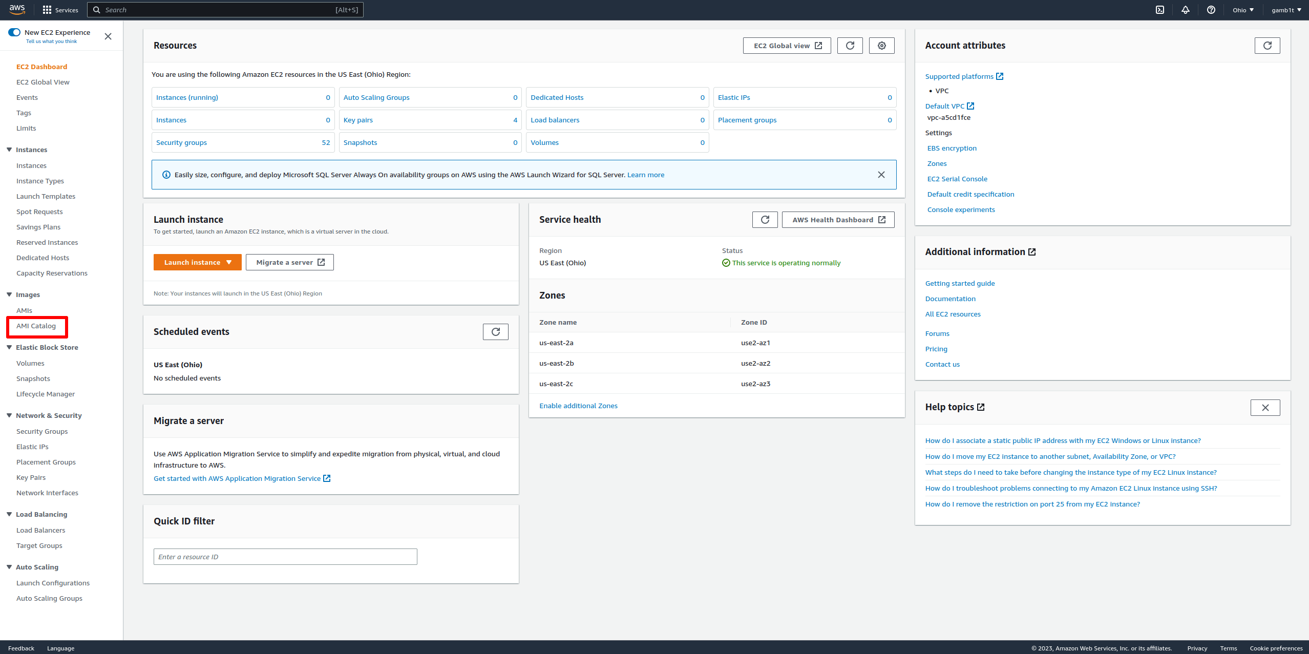 From here we will see the following screen. On this screen we want to look for “AMI Catalog” on the left side as shown: