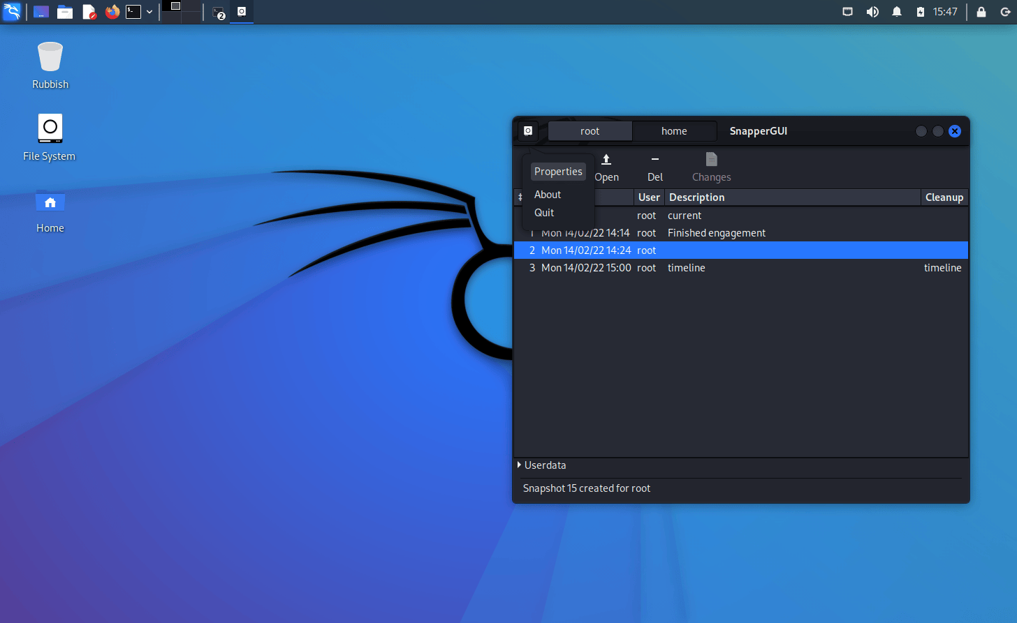 Out of the box Kali creates snapshots of the root directory to allow system rollbacks. Snapshots are automatically created during apt operations, at specified time intervals, and on every boot. The configuration can be changed via the “snapper-gui” tool. Just click on the little icon in the top left hand corner and select “Properties”: