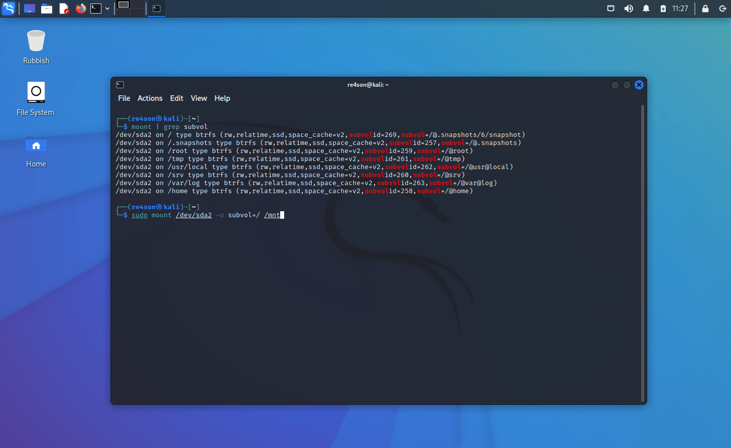 sudo mount /dev/sda2 -o subvol=/ /mnt