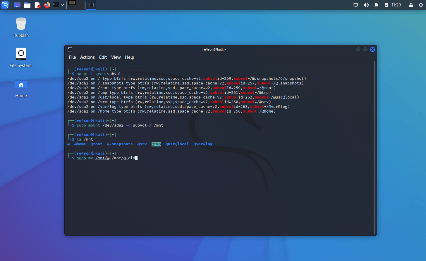 - Before we replace the current root with our snapshot, let’s move “@” away just to be safe: