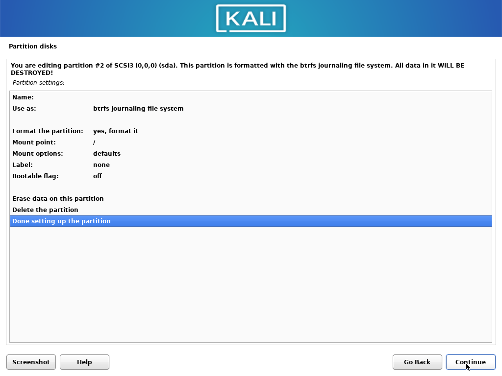 - The installation steps are identical to a default Kali installation except changing “ext4” to “btrfs” as file system: