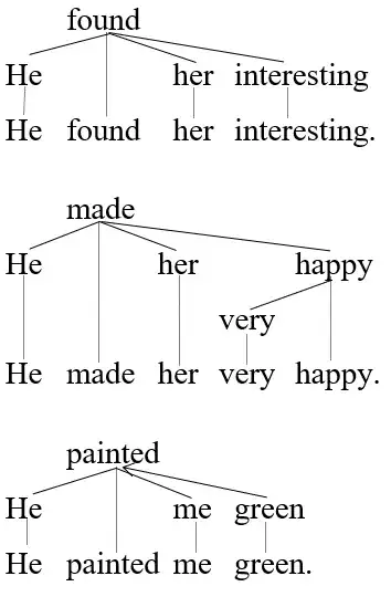 The flatness of these structures is suggestive of the semantic relationship between the object and the predicative adjective, whereby the adjective serves to assign a property to the object: 'She is interesting', 'She is very happy', and 'I am green'.