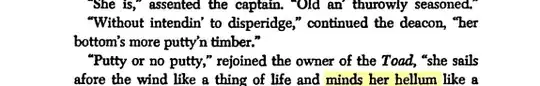 The spelling ‘hellum’ indicates a dialect pronunciation of ‘helm’, meaning the steering gear of the ship, presumably a ship’s wheel in the case of the Toad. There are lots of other dialect spellings in this passage, for example ‘thurowly’ for ‘thoroughly’ and ‘disperidge’ for ‘disparage’. For a ship to ‘mind her helm’ means to be obedient to steering, so that when the steersman turns the wheel the ship turns quickly and without resistance: ‘like a lady’ means ‘gracefully’.