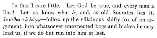 In that I care little. Let God be true, and every man a liar! Let us know what IS, and, as old Socrates has it, epesthai to logo—follow up the villainous shifty fox of an argument, into whatsoever unexpected bogs and brakes he may lead us, if we do but run into him at last.
